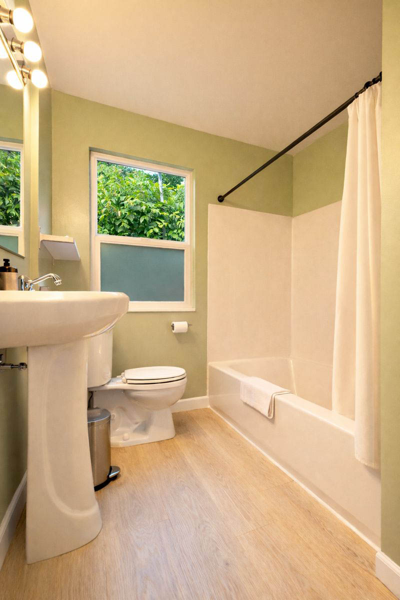 Bathrooms: One, modern fixtures, eco amenities
